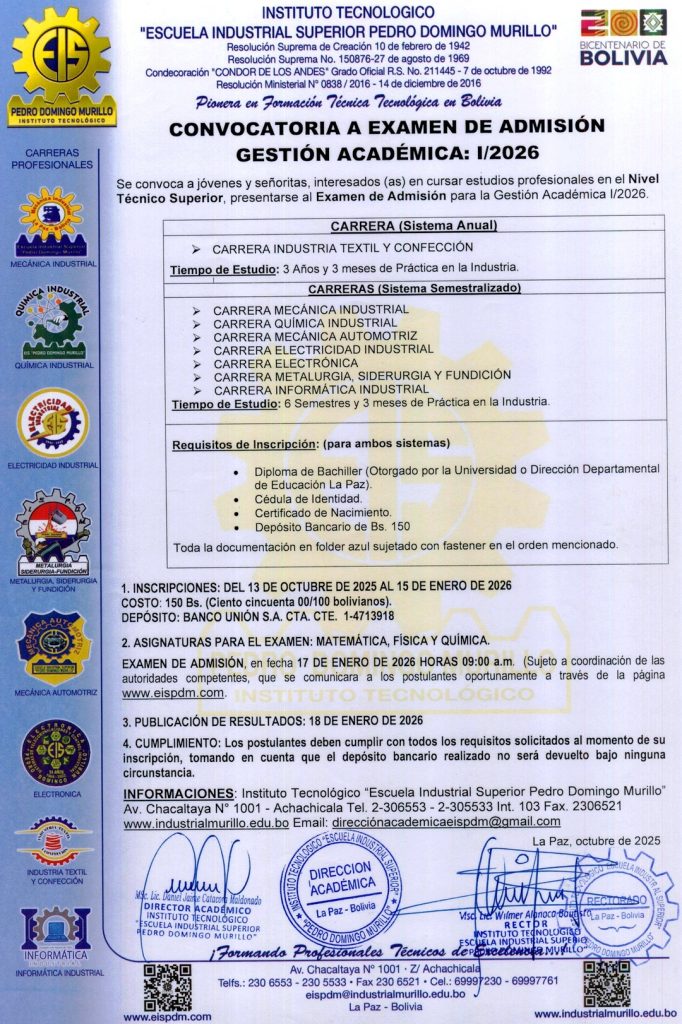El Instituto Tecnológico Escuela Industrial Superior «Pedro Domingo Murillo», convoca a jóvenes y señoritas, interesados (as) en cursar estudios profesionales a nivel Técnico Superior, presentarse al Examen de Admisión para la Gestión Académica I/2026.
