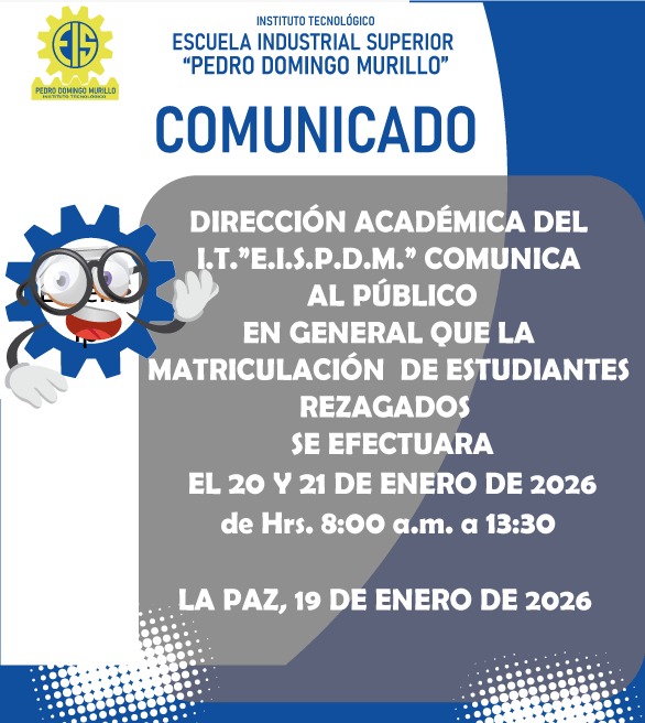 El I.T. Escuela Industrial Superior «Pedro Domingo Murillo» Comunica a toda la población estudiantil, que a través de Dirección Académica, que la Matriculación para los estudiantes rezagados de todas las carreras de la gestión I/2026, se realizara el día martes 20 y miércoles 21 de enero de 2026.