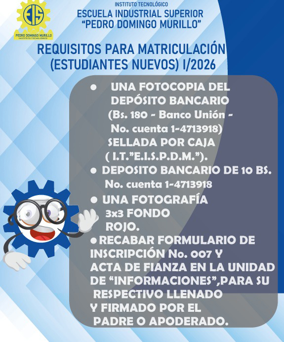 El I.T. Escuela Industrial Superior «Pedro Domingo Murillo» Comunica a los estudiantes nuevos de todas las carreras de la gestión I/2026, que a través de Dirección Académica, que la Matriculación para los estudiantes nuevos, se realizara los días 9, 10 y 11 de febrero de 2026.
